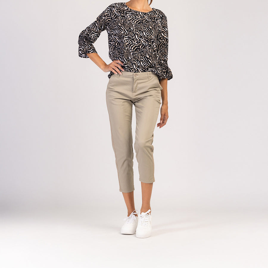 Ez a női 3/4 ujjú póló kifinomult bézs mintájával rabul ejt, amely könnyedén párosítható bármilyen stílussal. Puha viszkózból készült, kellemes légáteresztő képességet, kényelmet és laza, mégis kifinomult megjelenést biztosít.